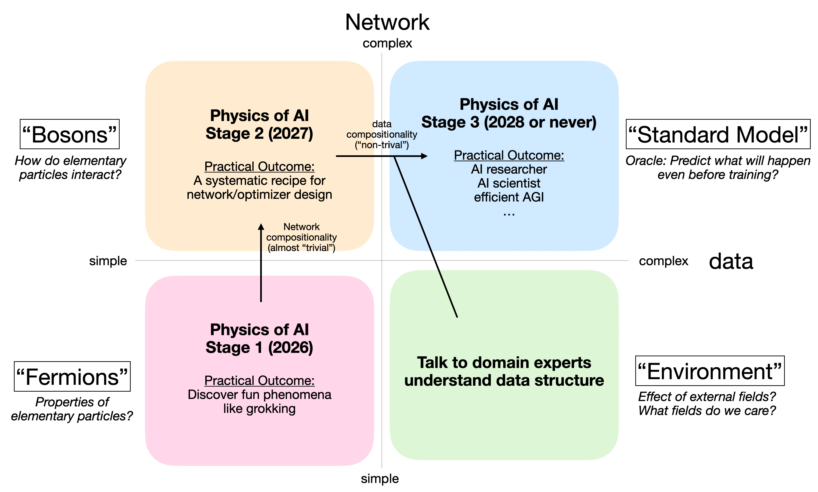 - Stage 3: The hardest step—moving from Stage 2 to Stage 3—requires understanding the data itself and therefore draws on domain expertise across fields. Physics analogy: what is the Standard Model of AI?
