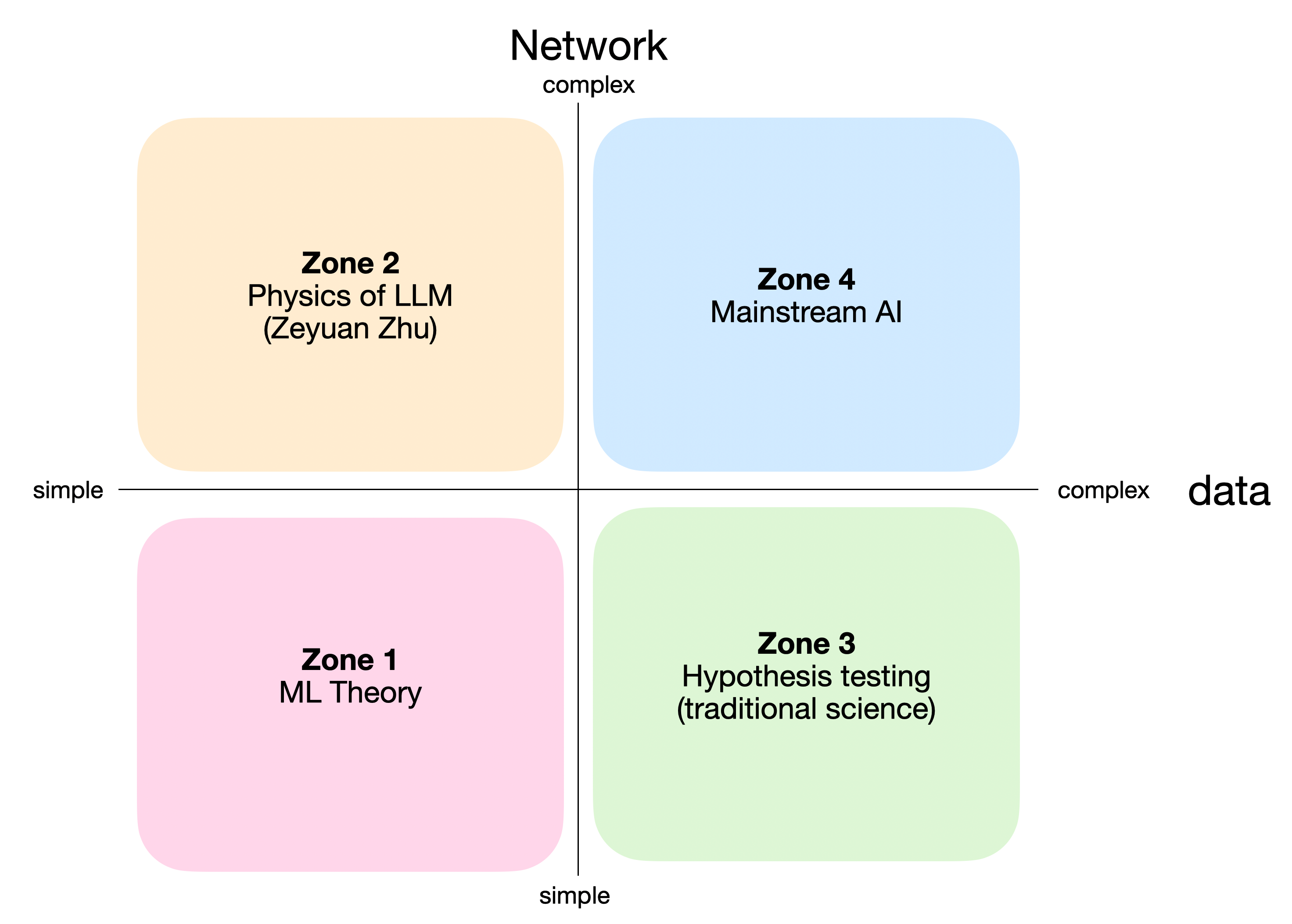 This is the regime of Zeyuan Zhu’s Physics of LLMs: carefully designed, controlled tasks paired with real-world LLMs. - Zone 3 — complex data, simple network.