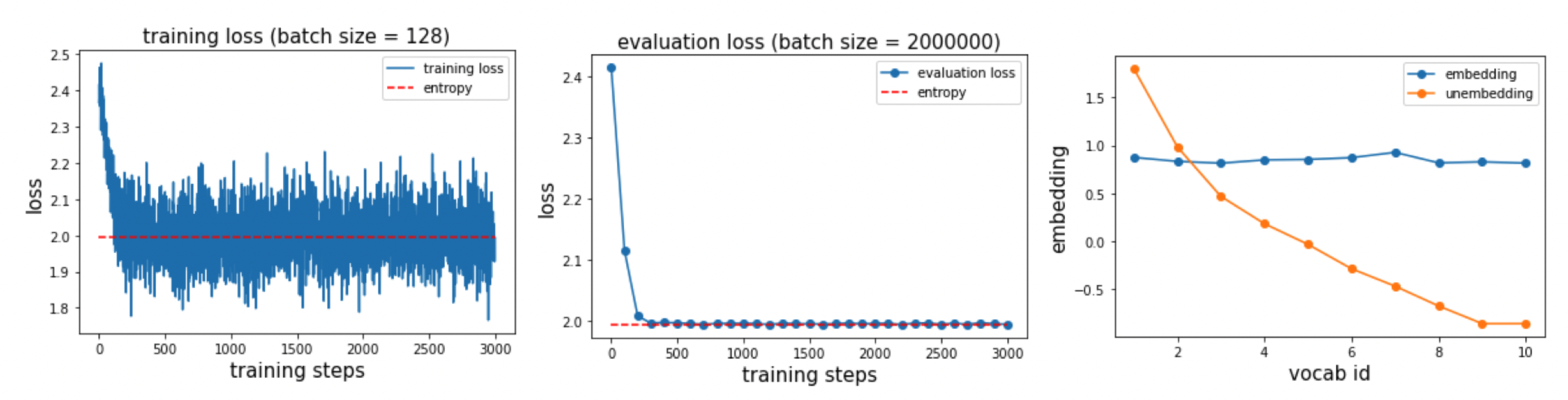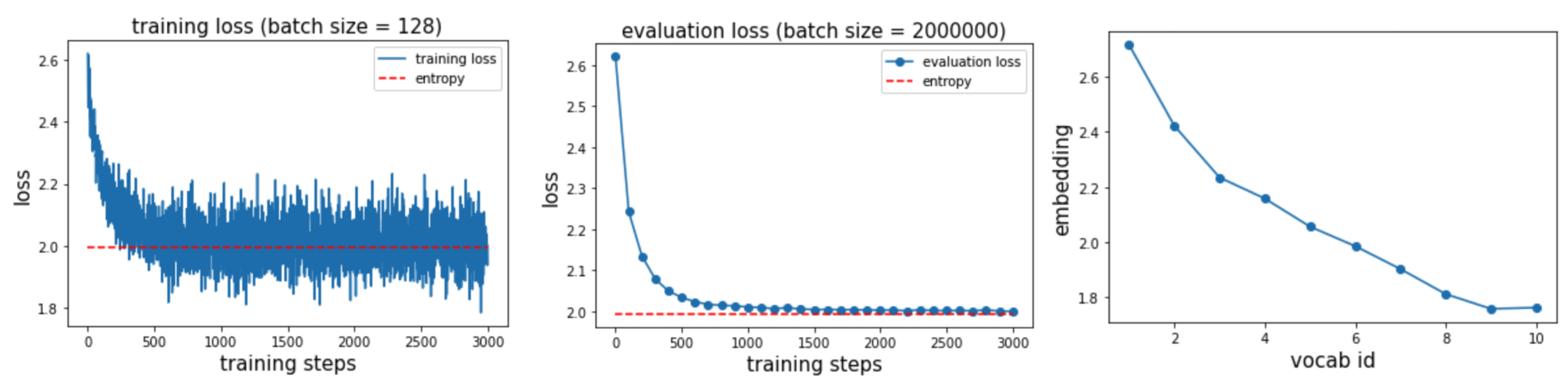 We take \(V = 10\), \(\alpha=1\), and embedding dimension \(D = 1\). Training uses batch size 128, while evaluation uses batch size 2,000,000. All data are drawn online. We find that training converges to the entropy (left and middle plots), and the learned embeddings show that tokens with higher frequency have larger values.