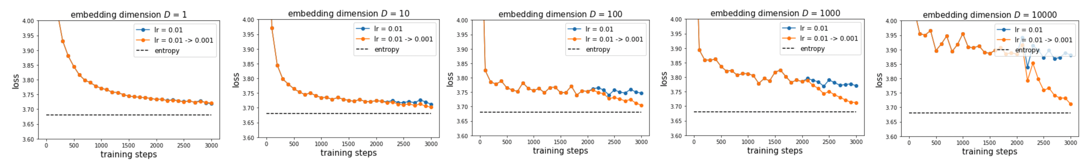 We next ask whether late-stage learning rate decay is helpful in this toy setup. We find that learning rate decay indeed helps, and the improvement becomes larger as the system size increases (i.e., larger embedding dimension \(D\)). We train for 2000 steps with \(\text{lr} = 0.01\), then linearly decay the learning rate from 0.01 to 0.001 over the final 1000 steps. We fix \(V = 100\) and \(\alpha = 1\).