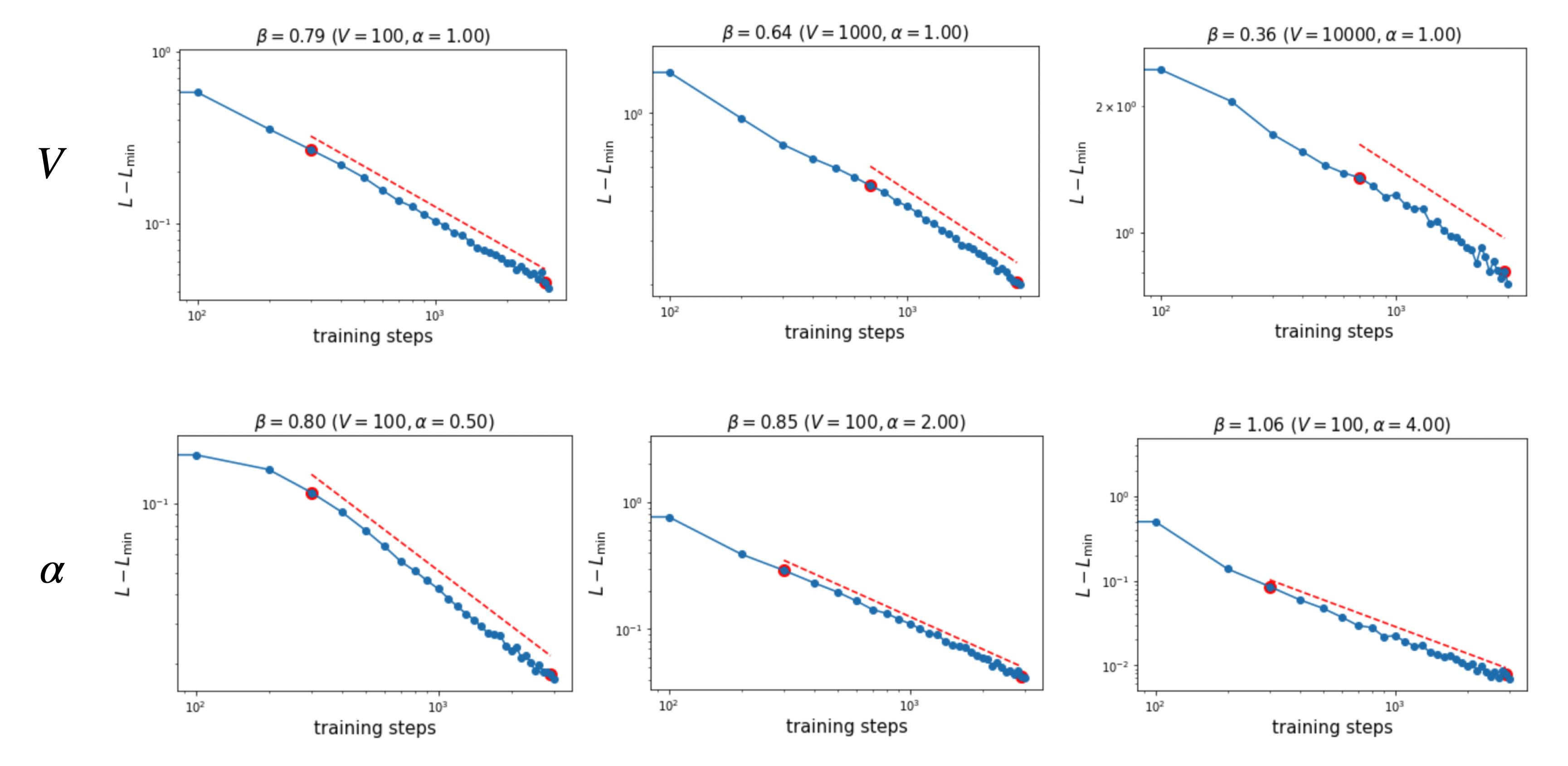 We study temporal scaling of the form \(L - L_{\rm min} \propto t^{-\beta},\) where \(\beta\) measures the speed of loss decay. We vary \(\alpha\) and \(V\) and examine how \(\beta\) depends on them. We fix \(D = 100\) and learning rate \(\text{lr} = 0.001\).