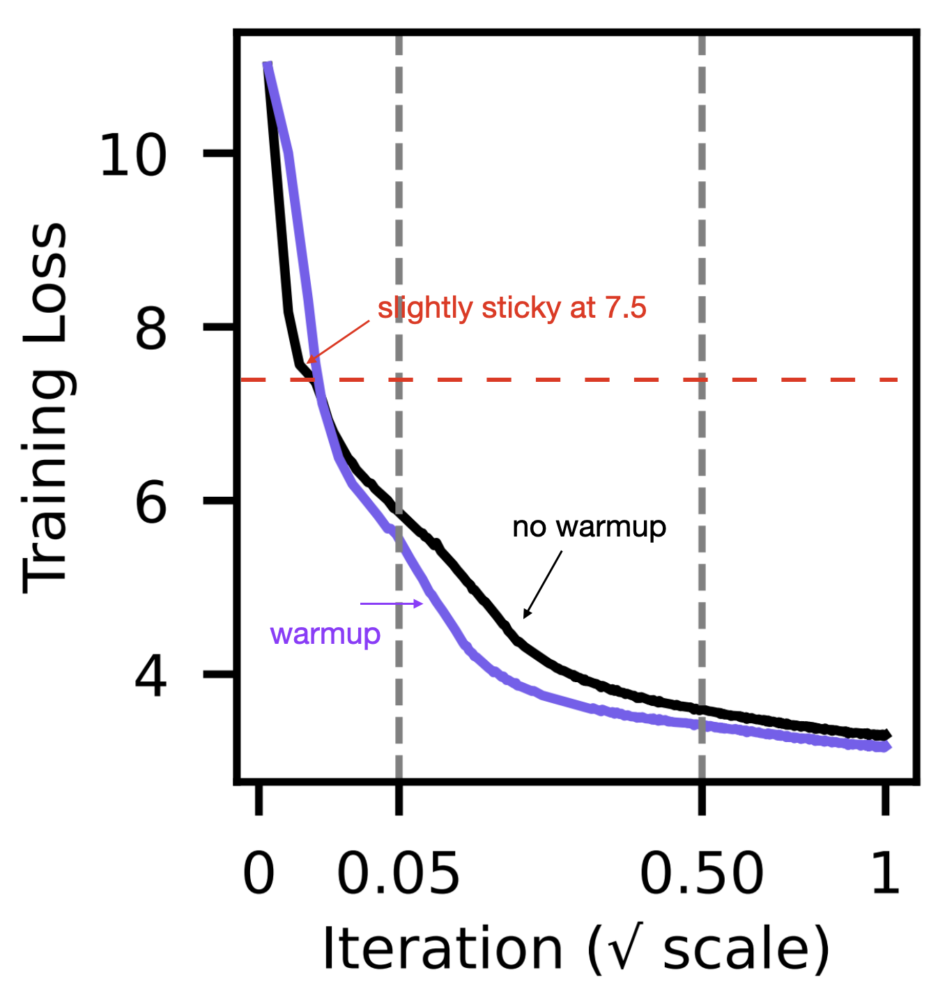 Here we provide another observation. In Analyzing & Reducing Learning Rate Warmup (paper), the authors found that without warmup, training descends faster initially but becomes slightly sticky around loss ≈ 7.5, after which it becomes slower than training with warmup: